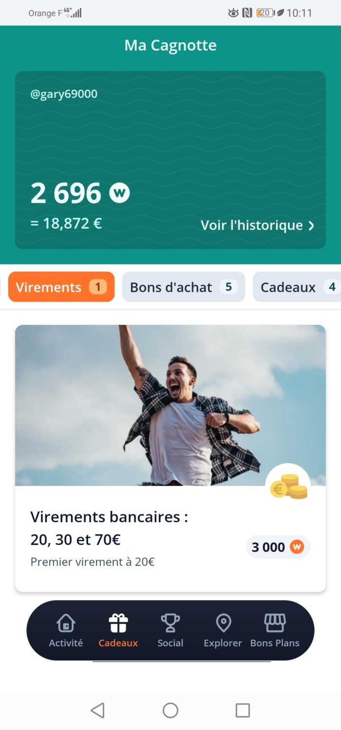 Vous pouvez retirez votre argent cumulée grâce à vos pas à partir de 20 euros, soit 3000 Wards.